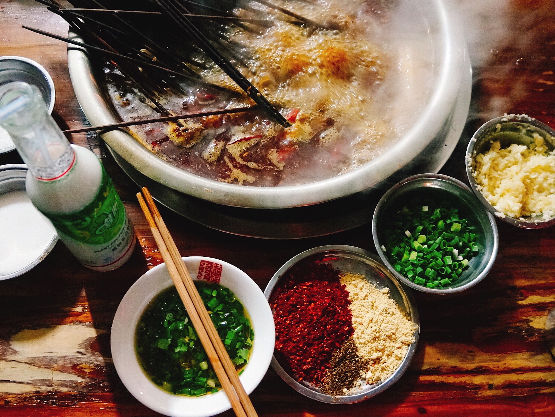 We love hot pot, but nothing says Chengdu like Chuan Chuan – in my mind it’s the definitive Chengdu meal and when I crave Chaun Chaun I go to Jiezi Xiao Jun Gan Chuan Chuan at Gang Guang Chang (钢管厂). Don’t be confused by the recent proliferation of the name ‘Xiao Jun Gan” Chuan Chuan. This place is the original and the best. Located inside an apartment complex which used to be the living quarter for the families of the factory workers in the area, the whole street sprawls with tables and chairs from dinner until midnight every day, every season. Served in the classic ‘hot-pot’ style (热锅)with the broth boiling at each table, the specialty here is chicken gizzards – but really it is the contagious celebratory atmosphere.